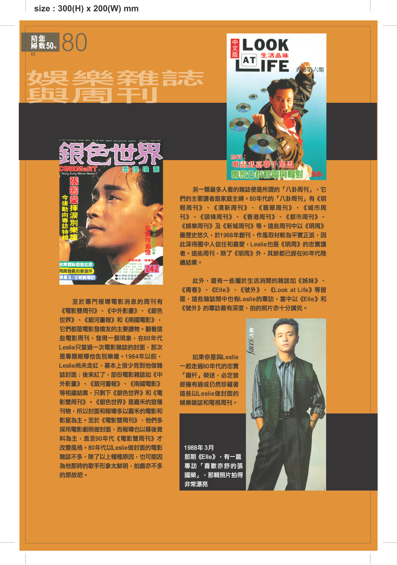 2006年9月12日是哥哥張國榮的50歲壽辰,全體張國榮迷都非常重視,本書正是為了紀念這個重要日子而編製。回顧過去50年,哥哥張國榮作為一位劃時代巨星,他的個人成長歷程,作為流行歌手、著名演員、文化符號的重要身份,都陪伴了香港幾代人度過不少悲歡離合的重要時光。本書以哥哥作為中心點,帶領讀者回顧香港由20世紀50年代至21世紀初的歷史、社會及文化變遷,同時向哥哥與他所熱愛的香港致敬。